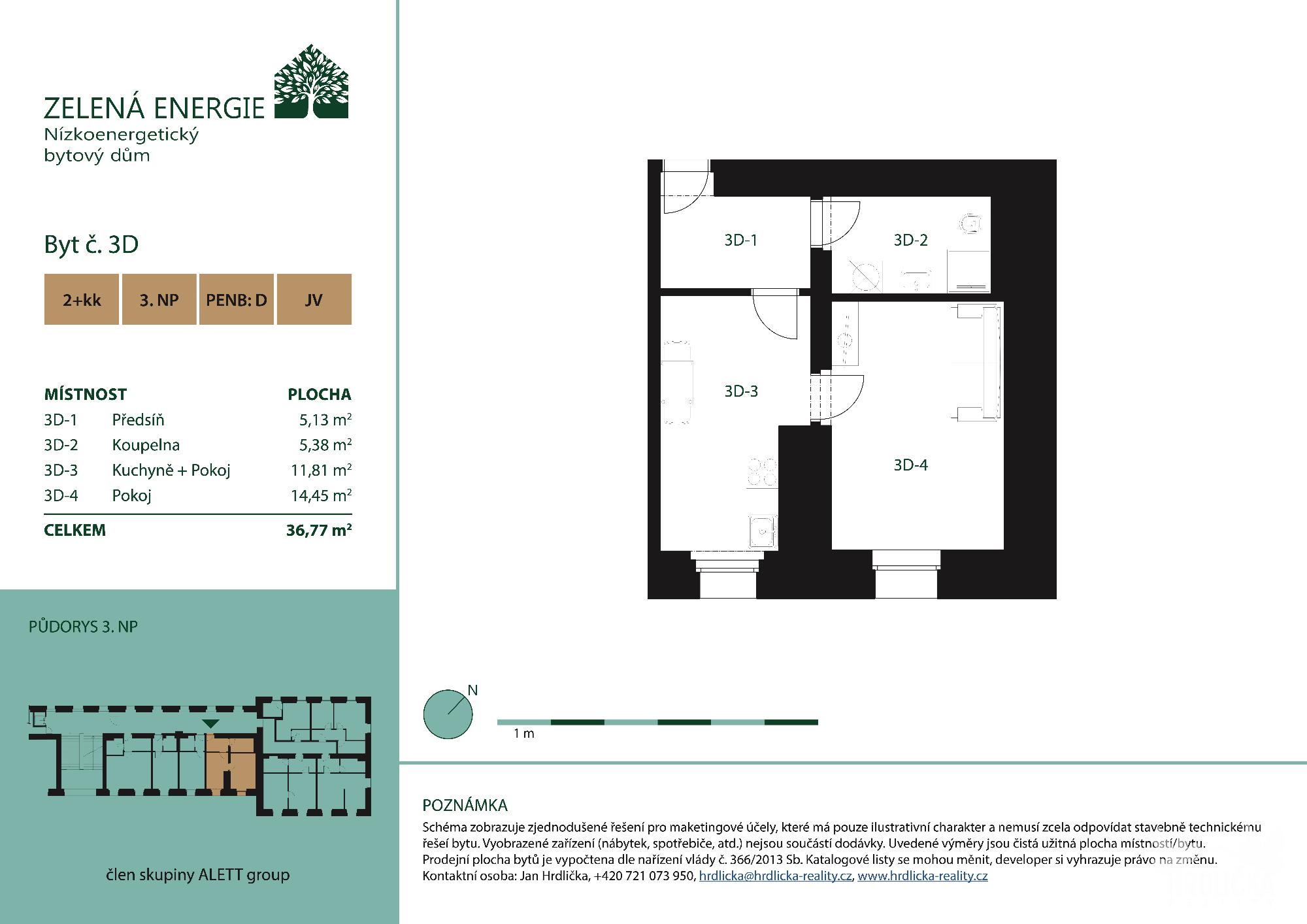 Zde se jedná konkrétně o jednotku 1+kk o obytné ploše 36,9 m2, která je umístěna v 2.NP a 3.NP. Okna jednotky směřují na jižní stranu, což zajišťuje příjemně prosvětlené a teplé prostory, okenní prostor je vybaven elektrickými předokenními žaluziemi, kterými lze regulovat prostup světla i tepla. Sociální zařízení bytové jednotky tvoří koupelna spojená s WC vybavená sprchovým koutem v provedení viz fotodokumentace. Jednotka je vždy připravena pro osazení kuchyňské linky včetně vzduchotechniky pro odvod vzduchu z digestoře. Nášlapnou vrstvu podlah tvoří kvalitní vinylové podlahy. Nemovitost je vytápěna tepelnými čerpadly, které zajišťují i ohřev TUV a jsou napájeny z fotovoltaických panelů, které se nachází přímo na objektu, což zajištuje nízkoenergetický provoz celého bytového domu. Každá bytová jednotka má k dispozici jedno parkovací stání u domu a sklepní kóji.
