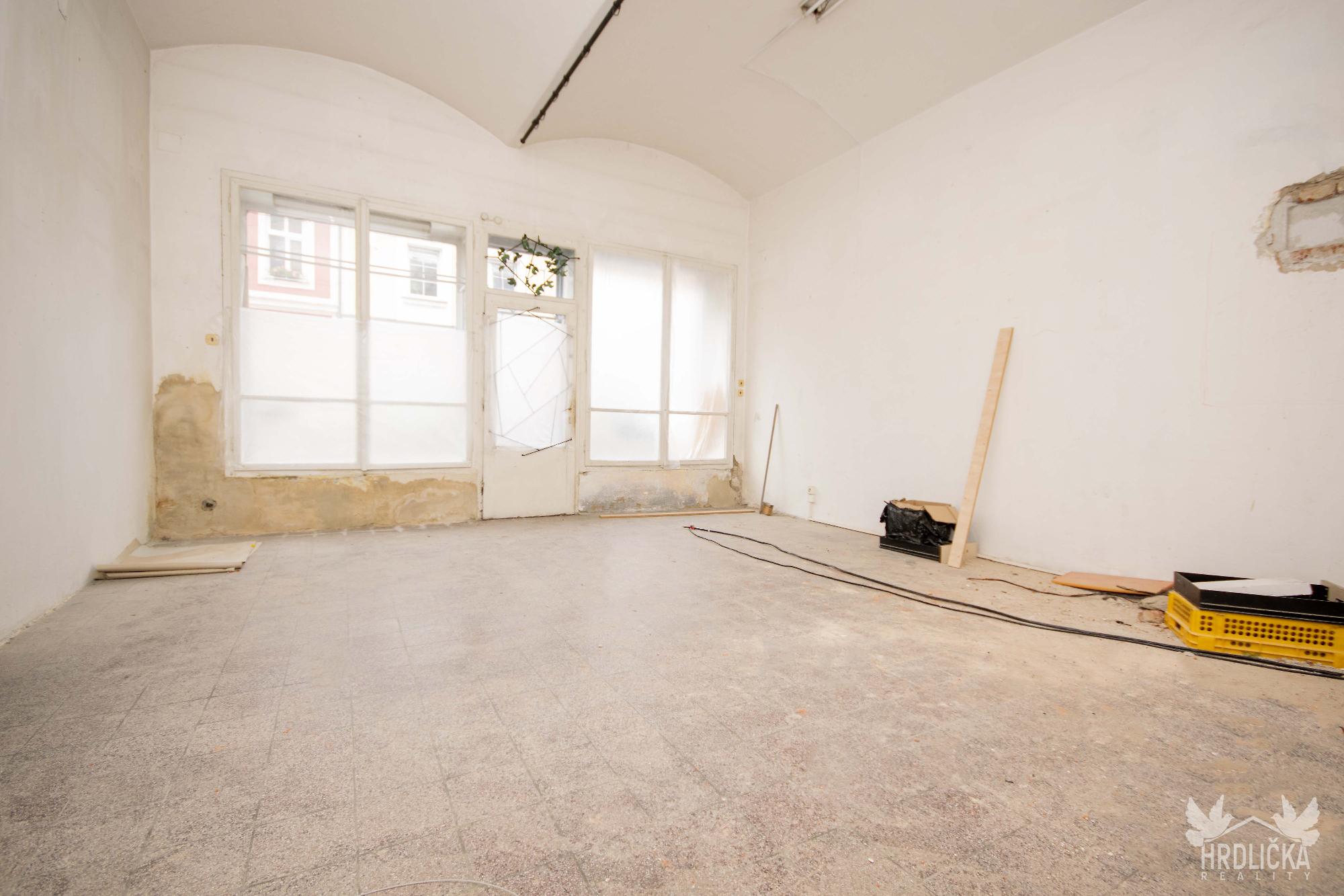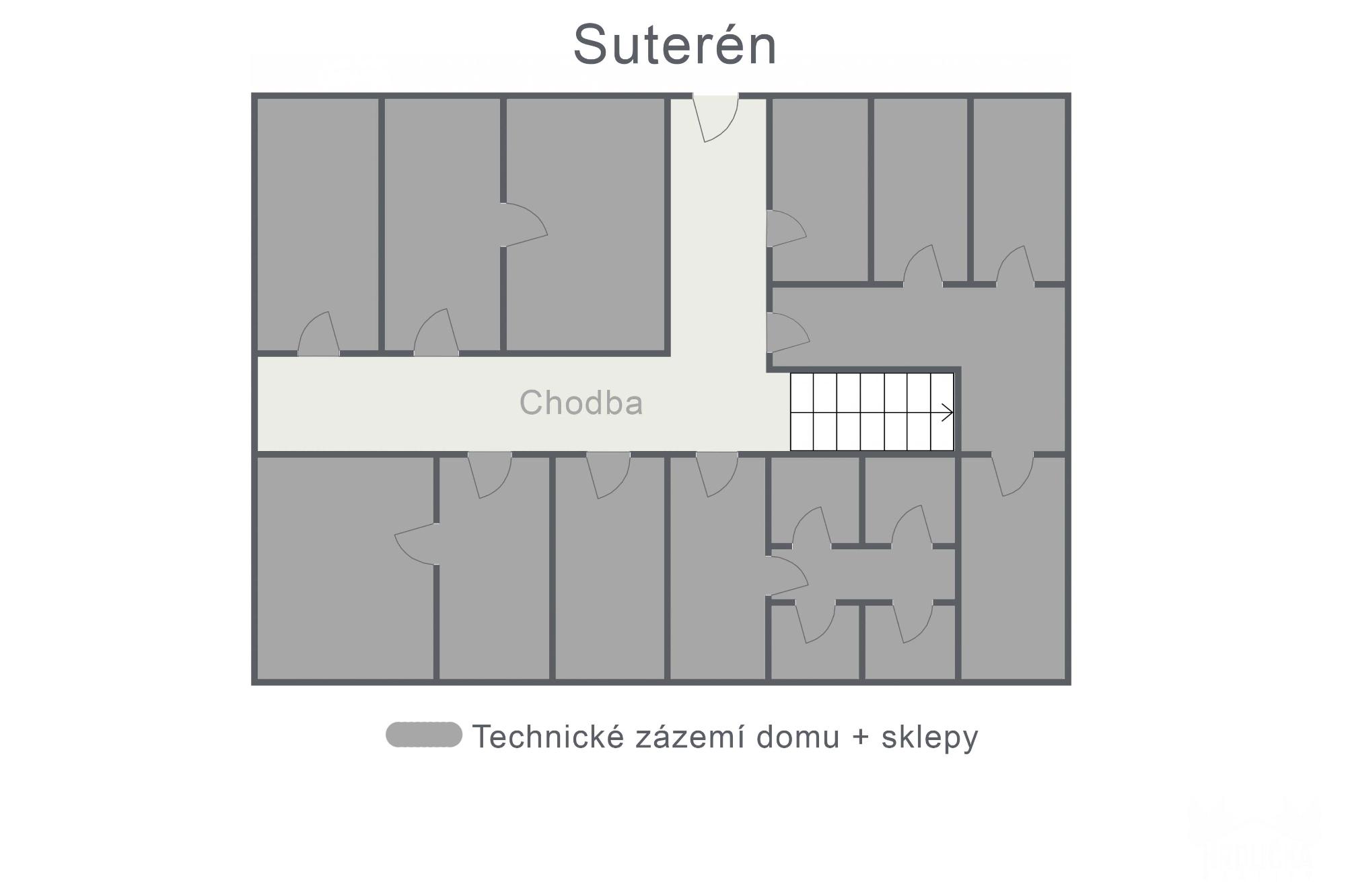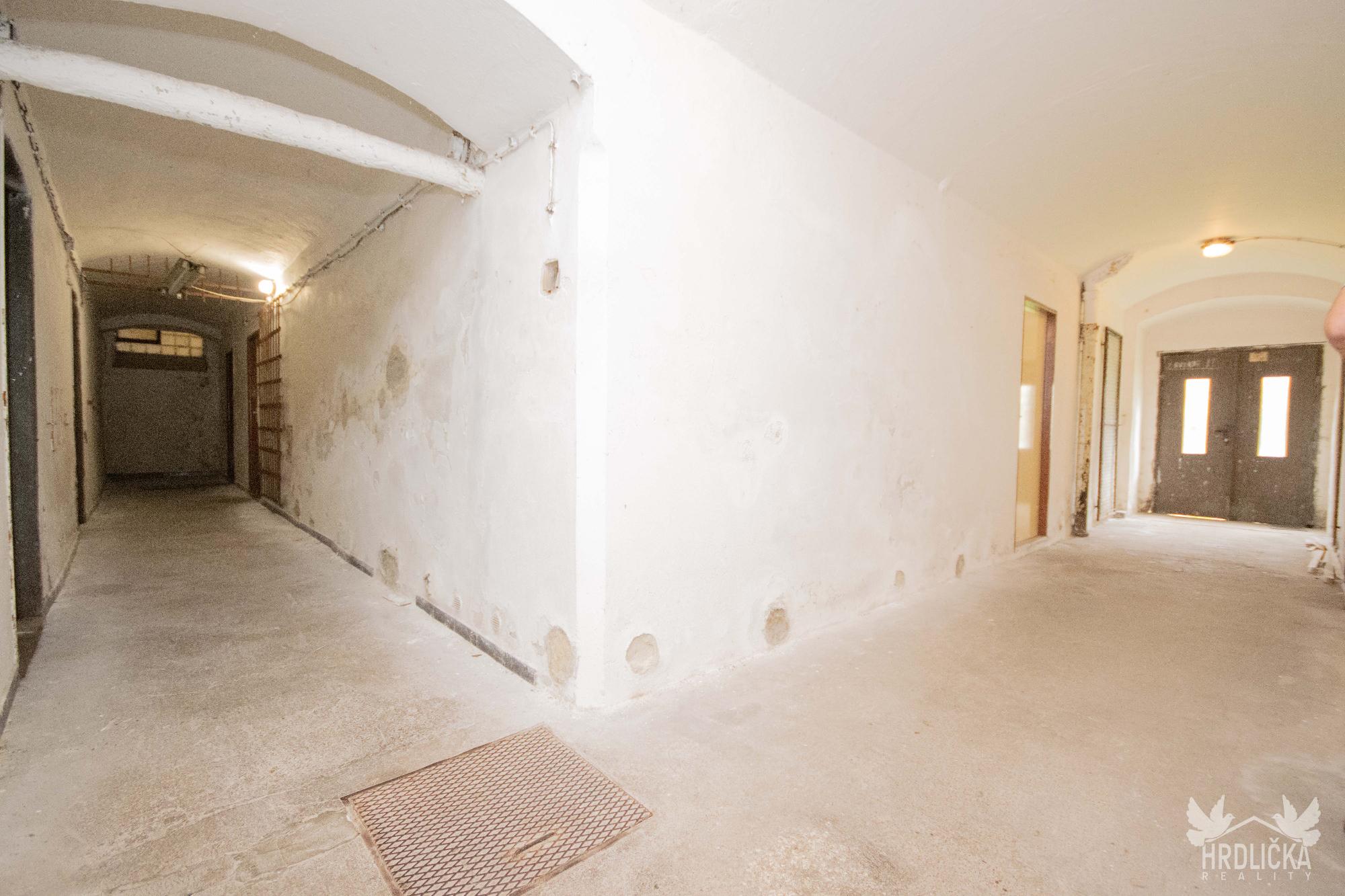 1.PP - Chladící box, sklady a šatna cukrárny (60 m2), další technické prostory domu a sklepy. Vstup na dvůr v úrovni terénu. (viz foto), jižní 1⁄2 suterénu má standardně umístěná okna.