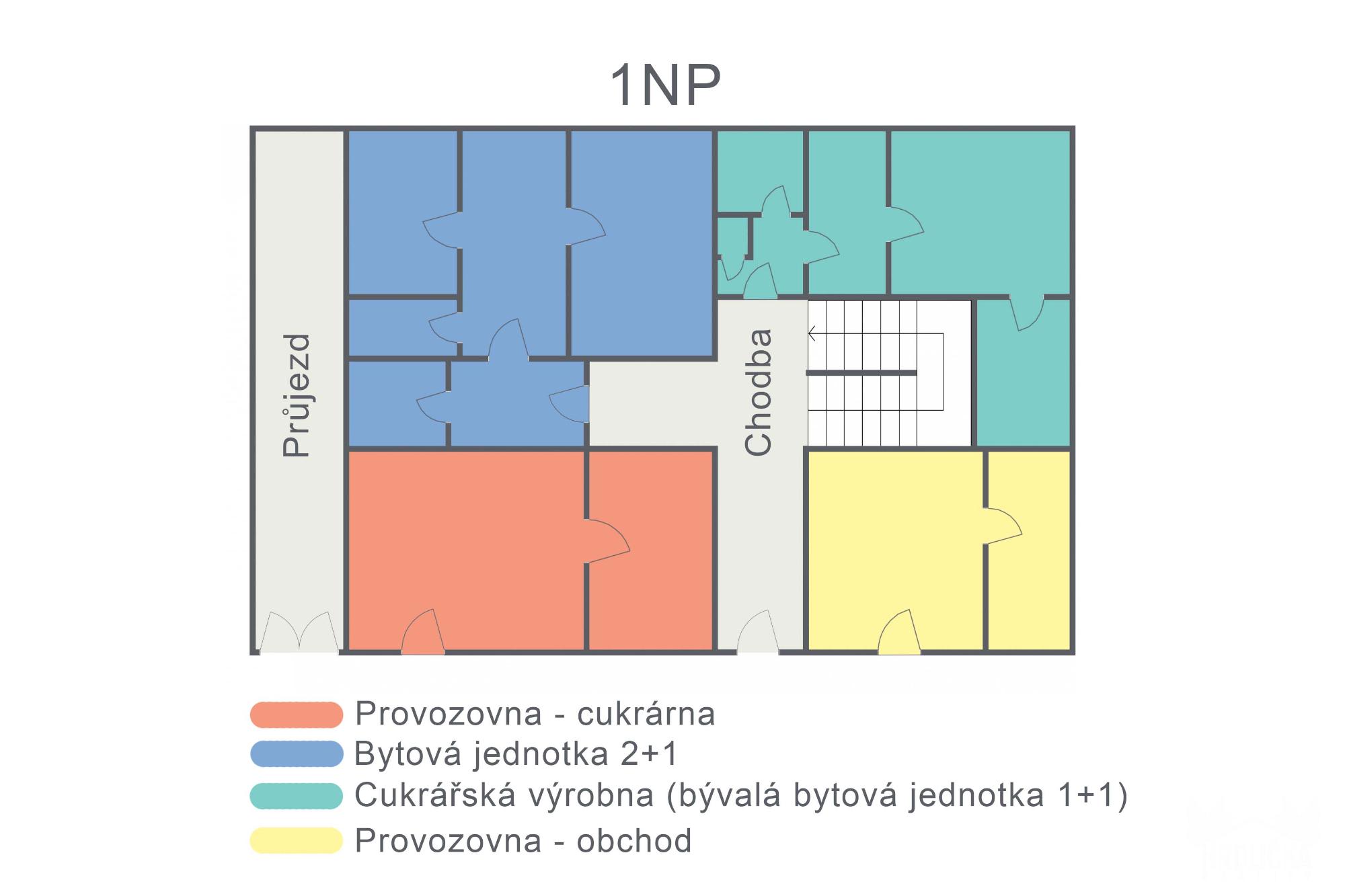 1.NP - Cukrárna 1+1 – prodejna + zázemí (63 m2), Prodejna 1+1 (49 m2) volná k adaptaci, Cukrářská výrobna 1+1 + chladicí prostor (63,4 m2), bytová jednotka 2+1 (78 m2).