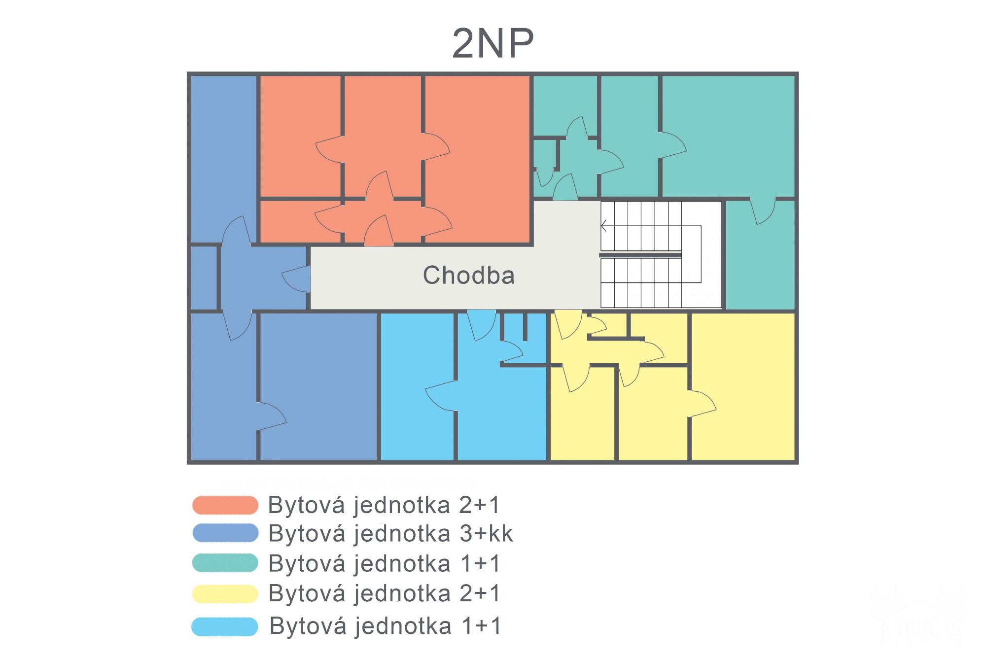 2.NP - 5 byt. jednotek: 1+1 (40,2 m2), 1+1 s komorou (63,4 m2), 2+1 (70 m2), 2+1 (69,9 m2) a 2+1 (89,5 m2).
